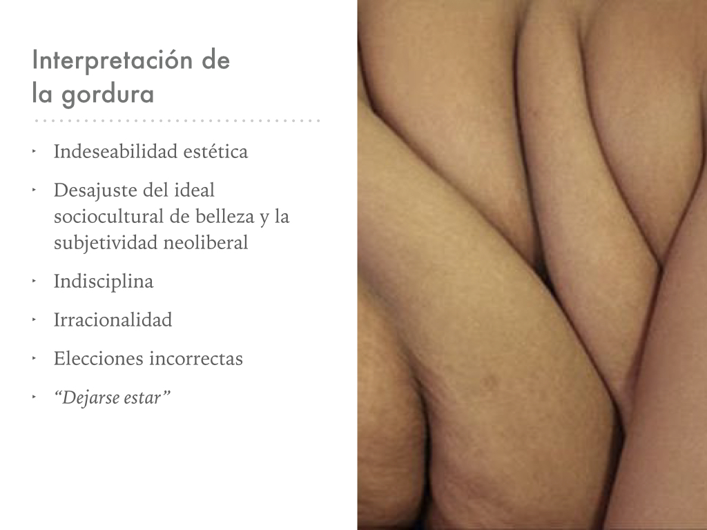 Se interpreta a las personas gordas como sujetos que renuncian al esfuerzo, que son incapaces de esgrimir la racionalidad neoliberal,por lo tanto, su raciocinio estaría dominado por el placer, la pasión, los excesos. Serían cuerpos que, como se dice, “se dejan estar”, en vez de optimizarse según los ideales socioculturales.