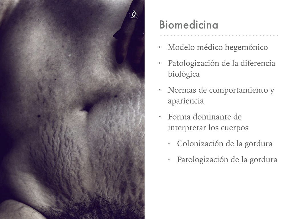 Entre los regímenes médicos, se denomina biomedicina al modelo médico hegemónico vigente en las sociedades occidentales. Se trata de un paradigma médico biologicista, individualista, que interpreta a los cuerpos en base a datos biológicos que son clasificados en categorías de enfermedad. Es decir, la diferencia corporal es entendida como una desviación del peso “normal”, y por ende, como enfermedad. Esto se evidencia en los términos médicos usados para describir a los cuerpos gordos, como sobrepeso, obesidad, y obesidad mórbida, que son etiquetas que transforman totalmente el significado del peso corporal.