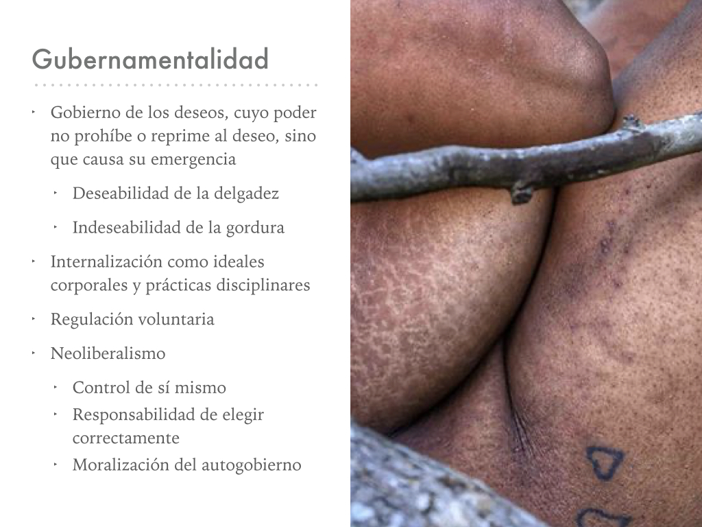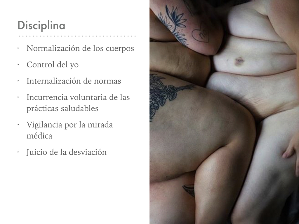 La vida diaria resulta regulada por la biomedicina desde el biopoder, que es la regulación y gobierno del cuerpo y la vida a partir de un regimen de lo deseable y lo legítimo, es decir, esta idea y prácticas de “lo saludable” que regulan nuestras vidas y que se ligan directamente con la delgadez.