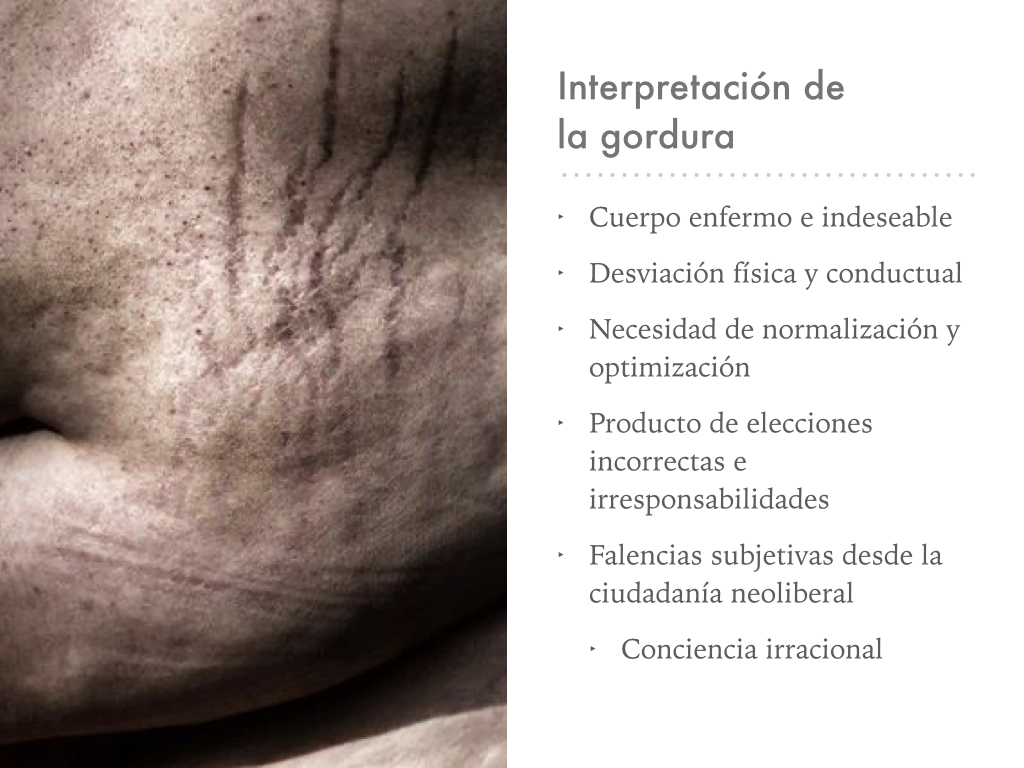 El cuerpo gordo es interpretado desde la biomedicina como un cuerpo enfermo y en necesidad de normalización, que es producido por elecciones incorrectas e irresponsabilidades, y que por lo tanto es un cuerpo moralizado en clave negativa, como un cuerpo que sería irracionalrespecto a lo estatuido como deseable; es decir, una subjetividad que poseería deseos incorrectos, y que por ende se desajusta de las normas de salud y subjetividad neoliberal.