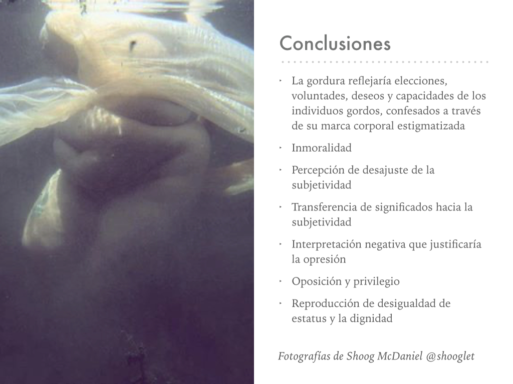 Como conclusiones podemos ver cómo la gordura es construida discursivamente como el opuesto del ideal de belleza corporal moderno, y que a su vez este ideal de belleza se condice con el ideal de salud, y con la apariencia del ciudadano responsable en clave neoliberal, todos ellos corporalizados en el cuerpo delgado.