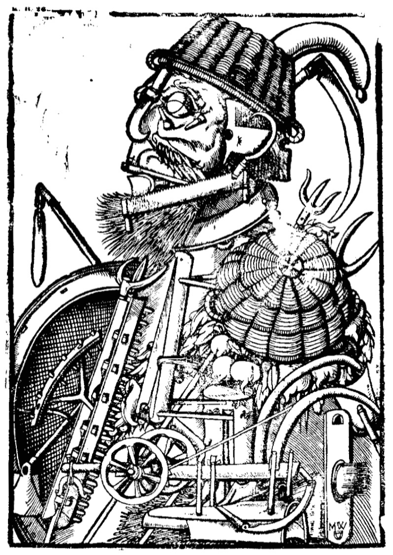 “Un ejemplo contundente de la concepción mecánica del cuerpo es este grabado alemán del siglo XVI en donde un campesino es representado exclusivamente como un medio de producción: su cuerpo completamente hecho de implementos agrícolas.” (226)